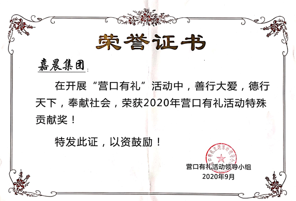嘉晨集團作為國家大型企業(yè)集團,在注重企業(yè)發(fā)展壯大的同時,不忘回報社會,反哺家鄉(xiāng),董事長他始終不忘“家國人”的“思源”、堅守“社會人”的“思報”,一直不負(fù)社會和國家的重托。多年來,一直以踐行社會責(zé)任為己任,在汶川地震、玉樹地震等國家為難時刻,都曾第一時間做出響應(yīng),通過捐款捐物等方式義不容辭地履行社會責(zé)任。2019年,營口市委為營造全社會知禮、懂禮、守禮、行禮的良好氛圍,開展“雷鋒文化 營口有禮”的主題活動,嘉晨集團捐款590萬元;為打造“營口名片”,冠名“營口號”高鐵列車贊助600萬元;今年的新冠肺炎疫情期間共計捐款530萬元,支持當(dāng)?shù)卣蜈A這場抗“疫”攻堅戰(zhàn)。在營口援鄂醫(yī)療隊勝利返營后,又向戰(zhàn)“疫"先鋒們捐款100萬,獎勵她們的英雄壯舉!今天再次向“營口有禮”基金捐贈500萬元,為營口有禮活動提供持續(xù)動力!