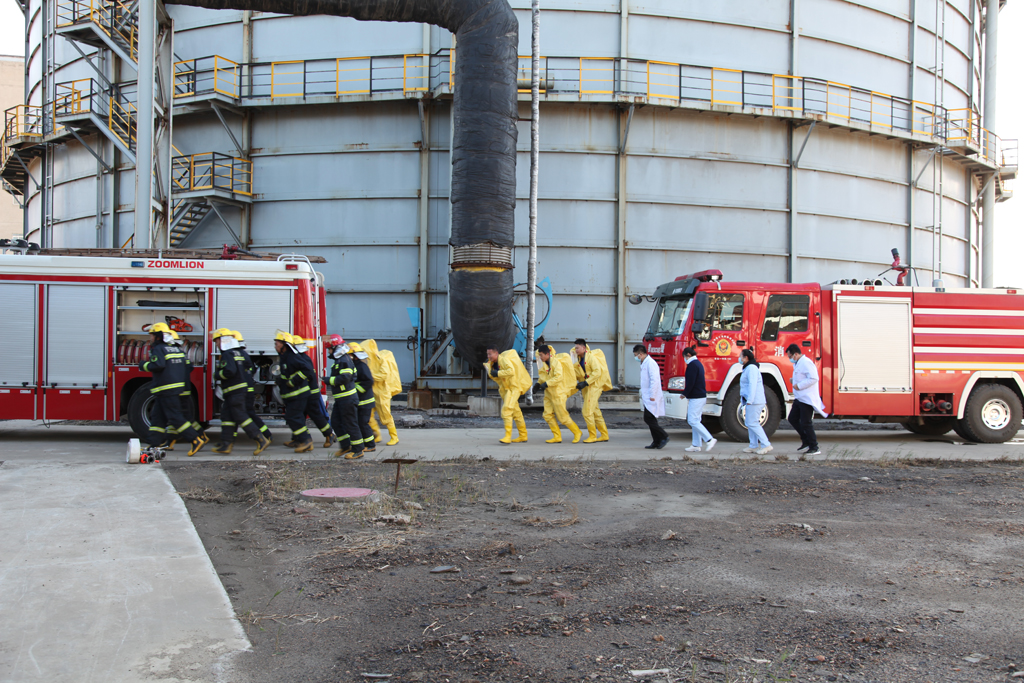 演練模擬場景為公司煤氣柜旁加壓機房煤氣出口管道閥門與法蘭連接處產(chǎn)生煤氣泄漏,造成3人中毒,隨后泄露煤氣與泄漏點管壁摩擦產(chǎn)生靜電引燃煤氣造成火災(zāi)事故。公司接警后立即啟動應(yīng)急響應(yīng),按照應(yīng)急預(yù)案及時對傷員救治,并迅速組織搶維修人員趕赴現(xiàn)場進行應(yīng)急處置,同時將險情上報至政府相關(guān)部門,應(yīng)急、公安、消防、生態(tài)環(huán)境、衛(wèi)生健康等應(yīng)急聯(lián)動力量立即趕赴現(xiàn)場協(xié)同處置.